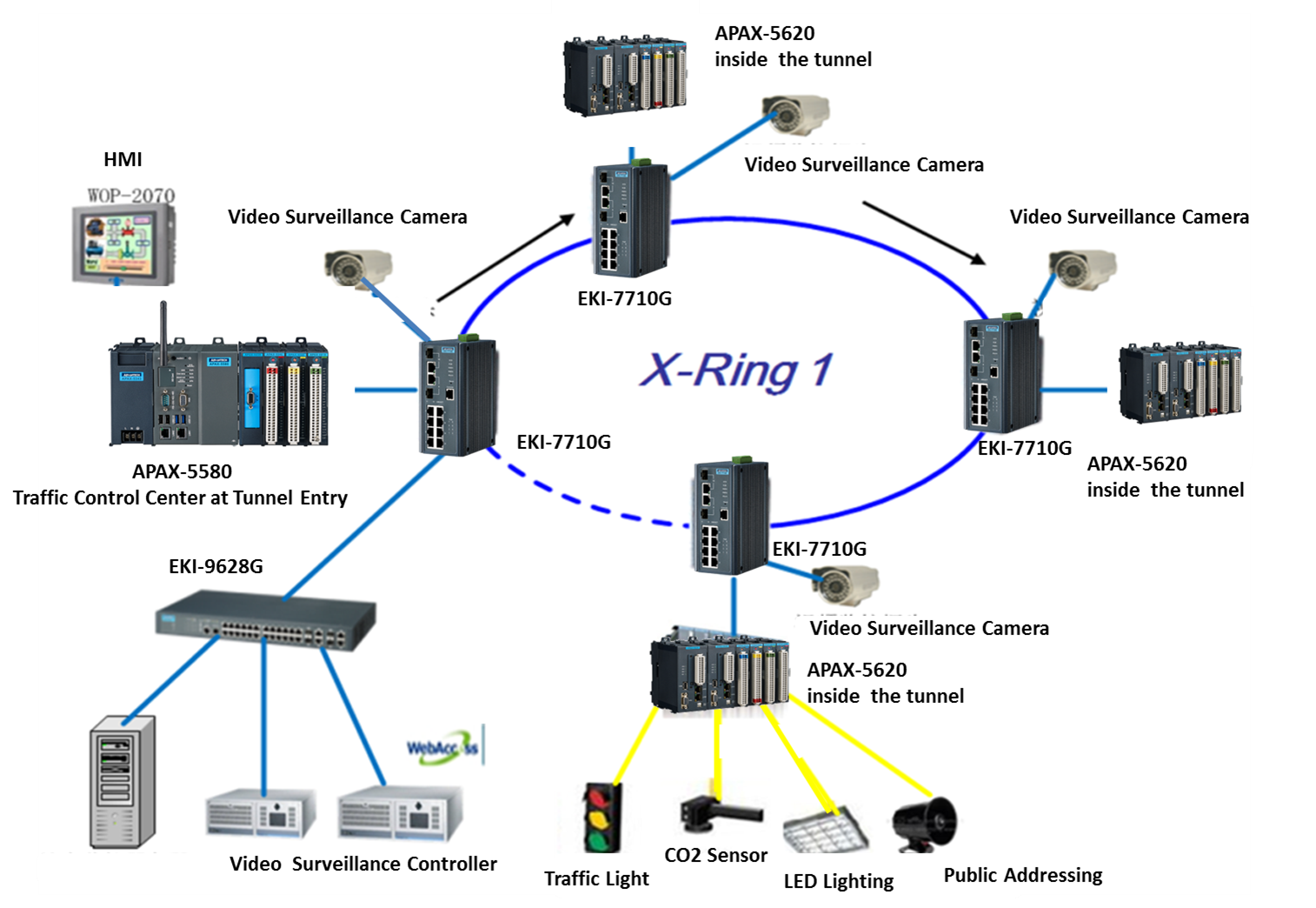 隧道監(jiān)控系統(tǒng)由幾個(gè)子系統(tǒng)組成,分別是照明,通風(fēng),交通指導(dǎo),閉路電視,火災(zāi)報(bào)警/控制,緊急通信和公共廣播(PA)系統(tǒng)。對(duì)于照明和通風(fēng)系統(tǒng),研華提供工業(yè)以太網(wǎng)交換機(jī),可編程自動(dòng)化控制器(PAC)和X環(huán)冗余網(wǎng)絡(luò)技術(shù),用于子系統(tǒng)之間的監(jiān)視,控制和可靠的數(shù)據(jù)傳輸。 在該系統(tǒng)中,使用EKI-7710G交換機(jī)從隧道中的各種設(shè)備和設(shè)備收集數(shù)據(jù),并形成網(wǎng)絡(luò)環(huán)以實(shí)現(xiàn)數(shù)據(jù)冗余。然后將所有數(shù)據(jù)傳輸?shù)娇刂剖抑械腅KI-9428G第3層交換機(jī)。研華的EKI-7700系列工業(yè)管理以太網(wǎng)交換機(jī)使用戶能夠以經(jīng)濟(jì)高效的方式快速擴(kuò)展其工業(yè)網(wǎng)絡(luò)。其堅(jiān)固的設(shè)計(jì)還確保了可靠性和穩(wěn)定性,而研華的X-Ring技術(shù)提供了最短的可用恢復(fù)時(shí)間(<10 ms),從而提高了網(wǎng)絡(luò)基礎(chǔ)設(shè)施的可靠性和速度。